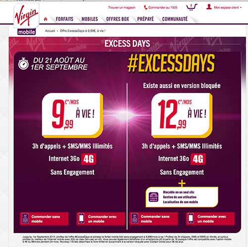 Profitez de l’offre exceptionnelle ExcessDays proposée par Virgin Mobile. Avec ExcessDays, vous bénéficierez d’un forfait mobile sans engagement pour seulement 9.99 euros/mois. Cette offre inclut 3h d’appels, des SMS ou MMS illimités et une connexion internet mobile en réseau 4G. De plus, en rajoutant seulement 3 euros, vous pourrez profitez de la toute nouvelle offre forfait bloqué Cockpit Conso.
