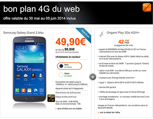 Opportunité à saisir chez Orange : le Samsung Galaxy Grand 2 est proposé avec une remise immédiate de 50€ avec le forfait Origami Play 3Go 4G H+. Cette offre est valable du 30 mai au 5 juin 2014. Du coup, l’appareil est proposé à 49,90€ au lieu de 99,90€. Le terminal est disponible en deux couleurs : le bleu et le blanc.